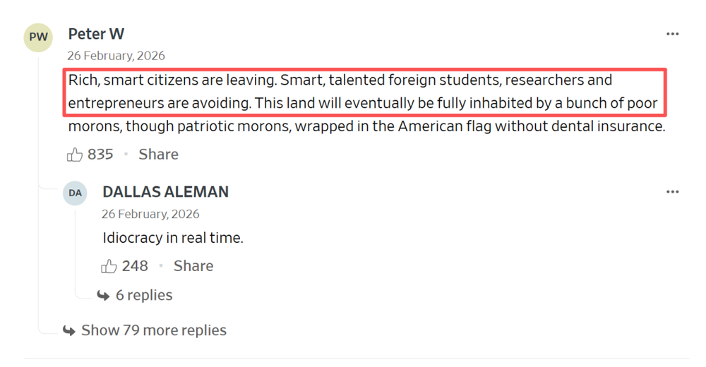 “富有聪明的公民正在离开,聪明有才华的外国留学生和企业家正在避开。这片土地最终将被一群没有牙医保险、却紧紧裹着美国国旗的‘爱国傻瓜’所占据”